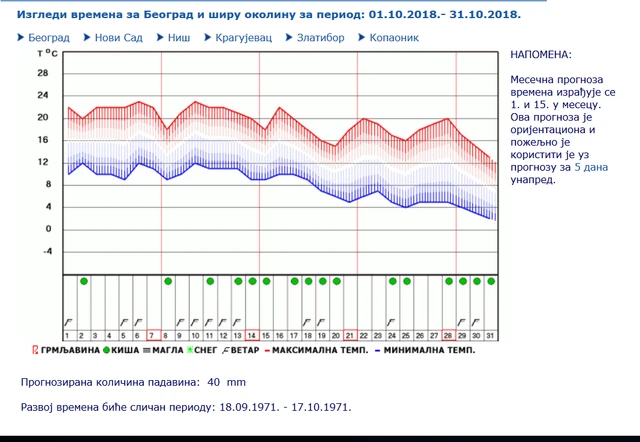 Sezonska prognoza republičkog meteorološkog zavoda srbije za neredne mesece. Srednja minimalna temperatura vazduha u oktobru imaće vrednosti u granicama višegodišnjeg proseka pri čemu će njena vrednost u proseku biti viša za oko 0 3ºs u odnosu na višegodišnji prosek. Naoblačenje i zahlađenje koje je zahvatilo srbiju od 17. Prosečne temperature kreću se u umerenoj zoni 8 9 c 48 f do 18 3 c 64 9 f sa 50 8mm 2 padavina i teško da mogu da pokvare nekome uživanje.