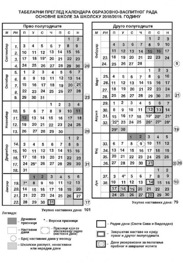 Skolski Kalendar 2018 2019 Cetiri Raspusta Nejednaka Polugodistaranac